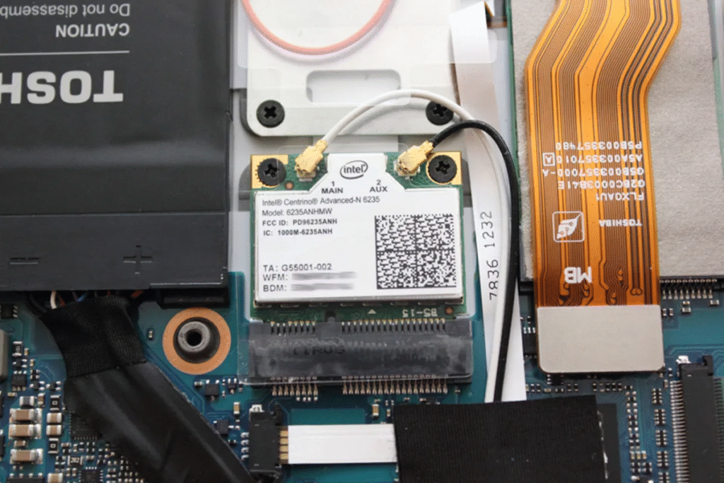 • Wi-Fi card locate करें (1–2 antenna wires वाला छोटा card)